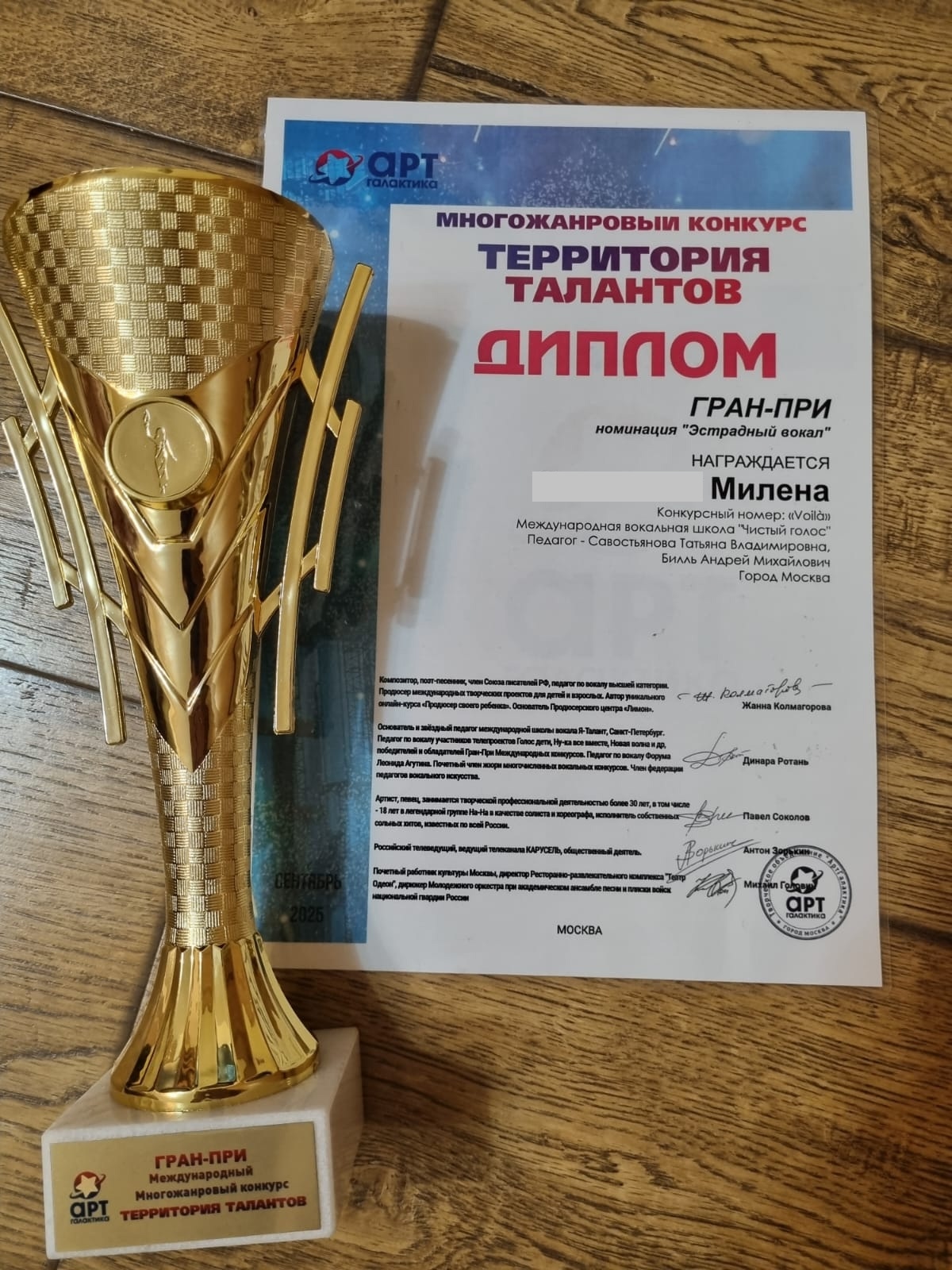 Ученица 4 класса Милена приняла участие в многожанровом конкурсе «Территория Талантов» стала его победителем в номинации вокал, получив дипломы Лауреата 1 степени и Гран-при!