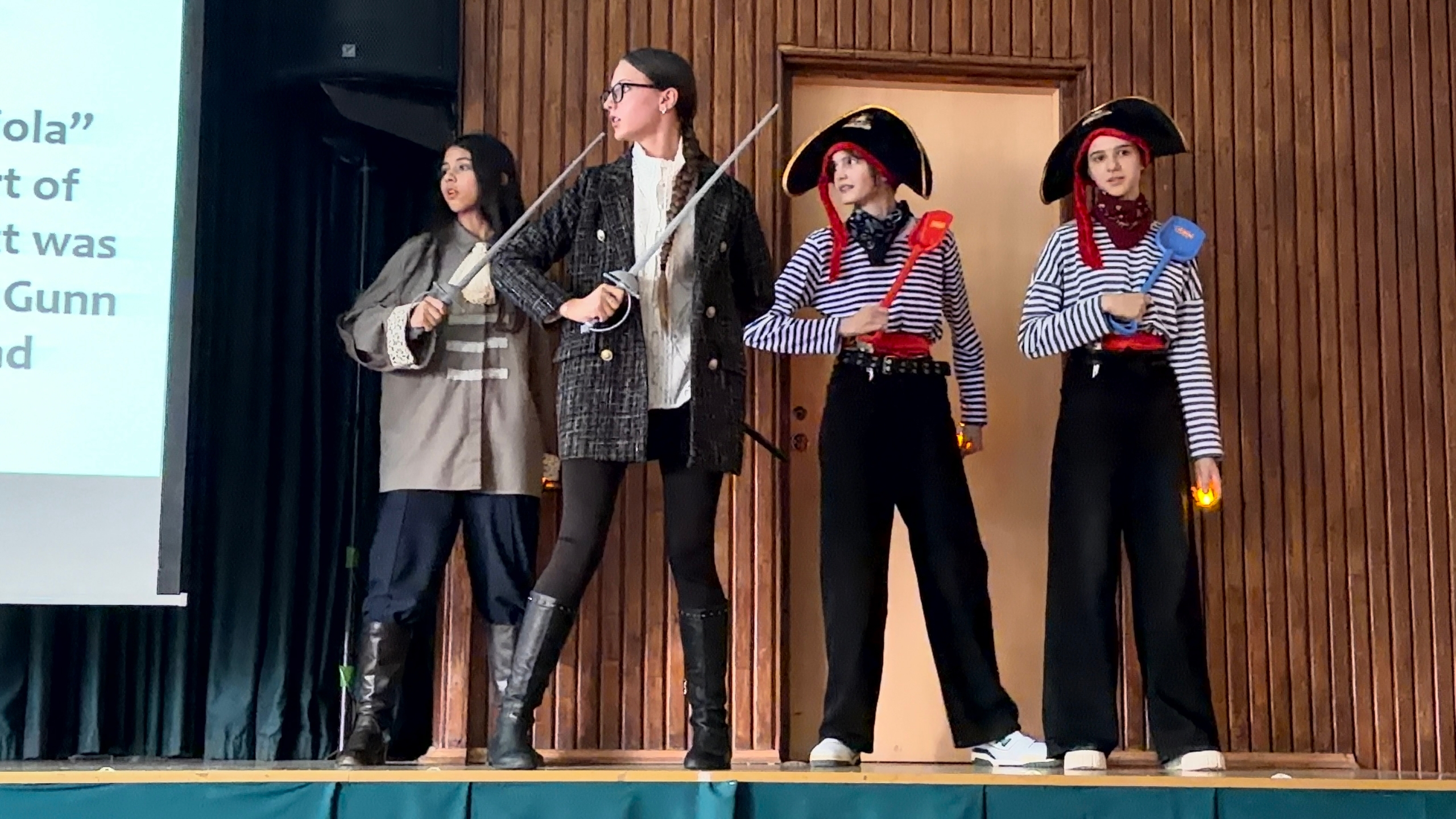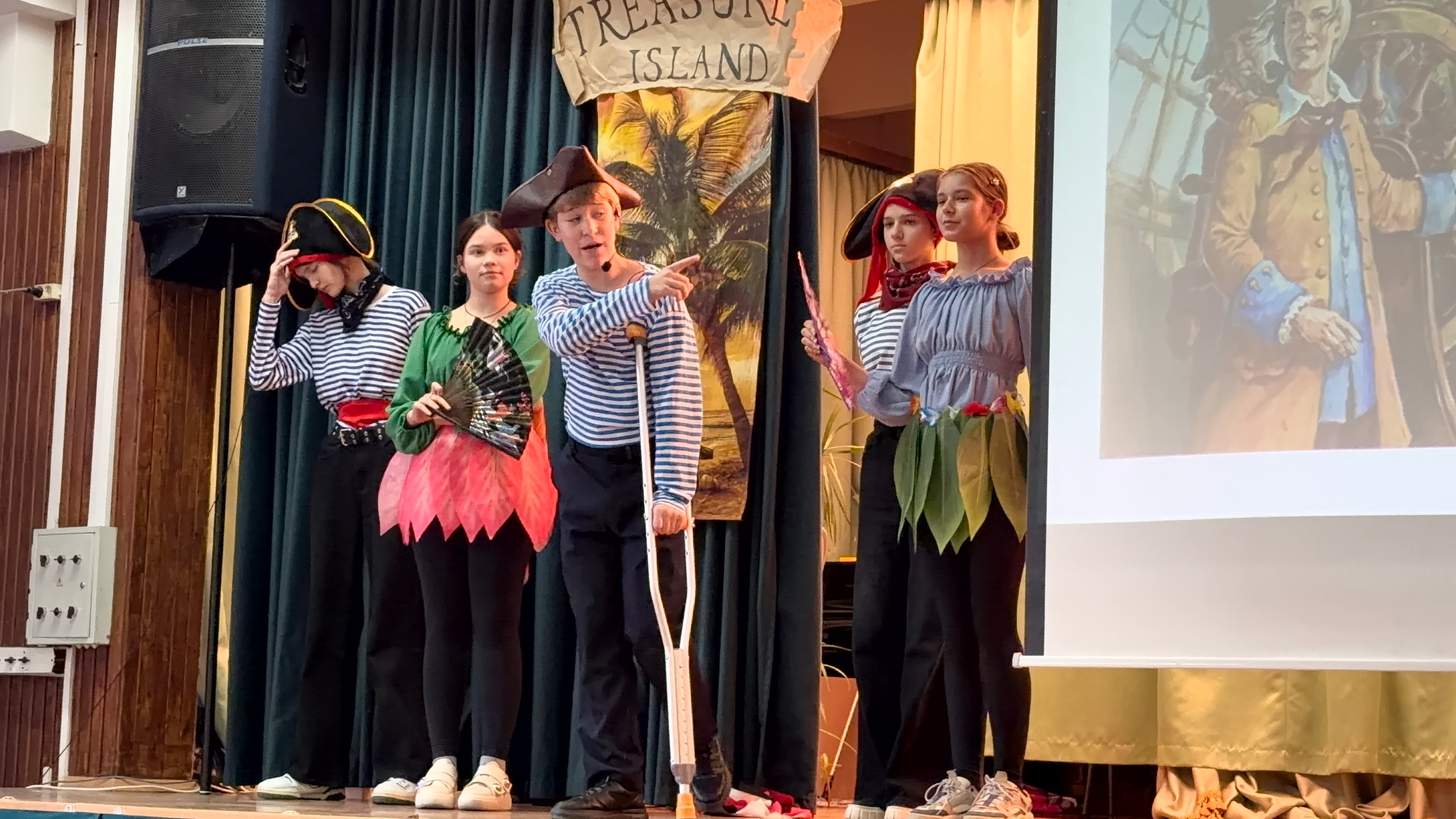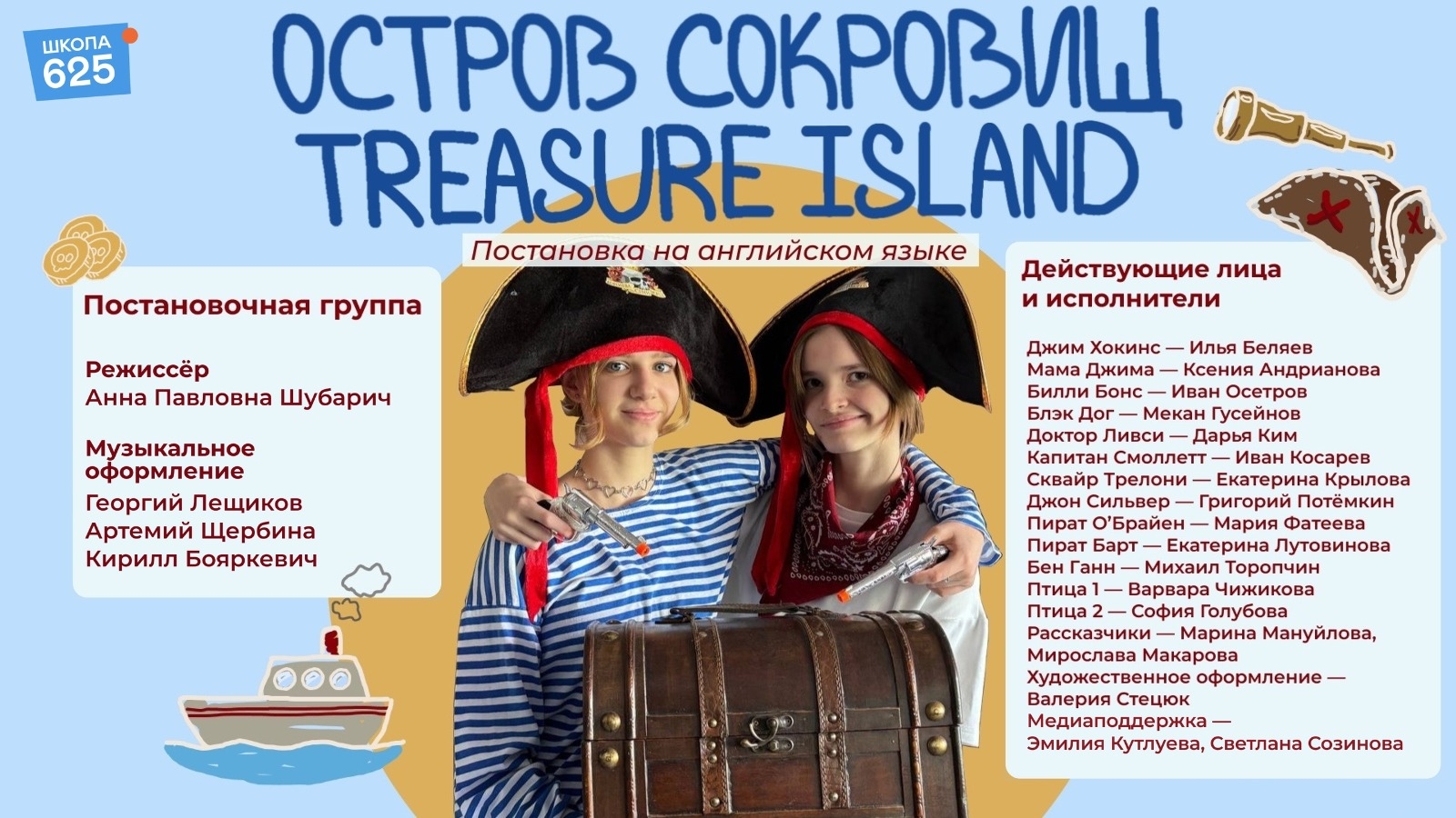 20 ноября в рамках московского городского проекта «Театр в школе» состоялась премьера спектакля на английском языке «Остров сокровищ», подготовленного учениками 7 и 11 классов. Режиссёр и сценарист постановки, учитель английского языка Анна Павловна Шубарич, поблагодарила администрацию и педагогов школы, медиа классы, волонтёров «Движения первых», родителей за огромную помощь в выпуске спектакля, а юных актёров - за искрометную игру и грамотную речь.